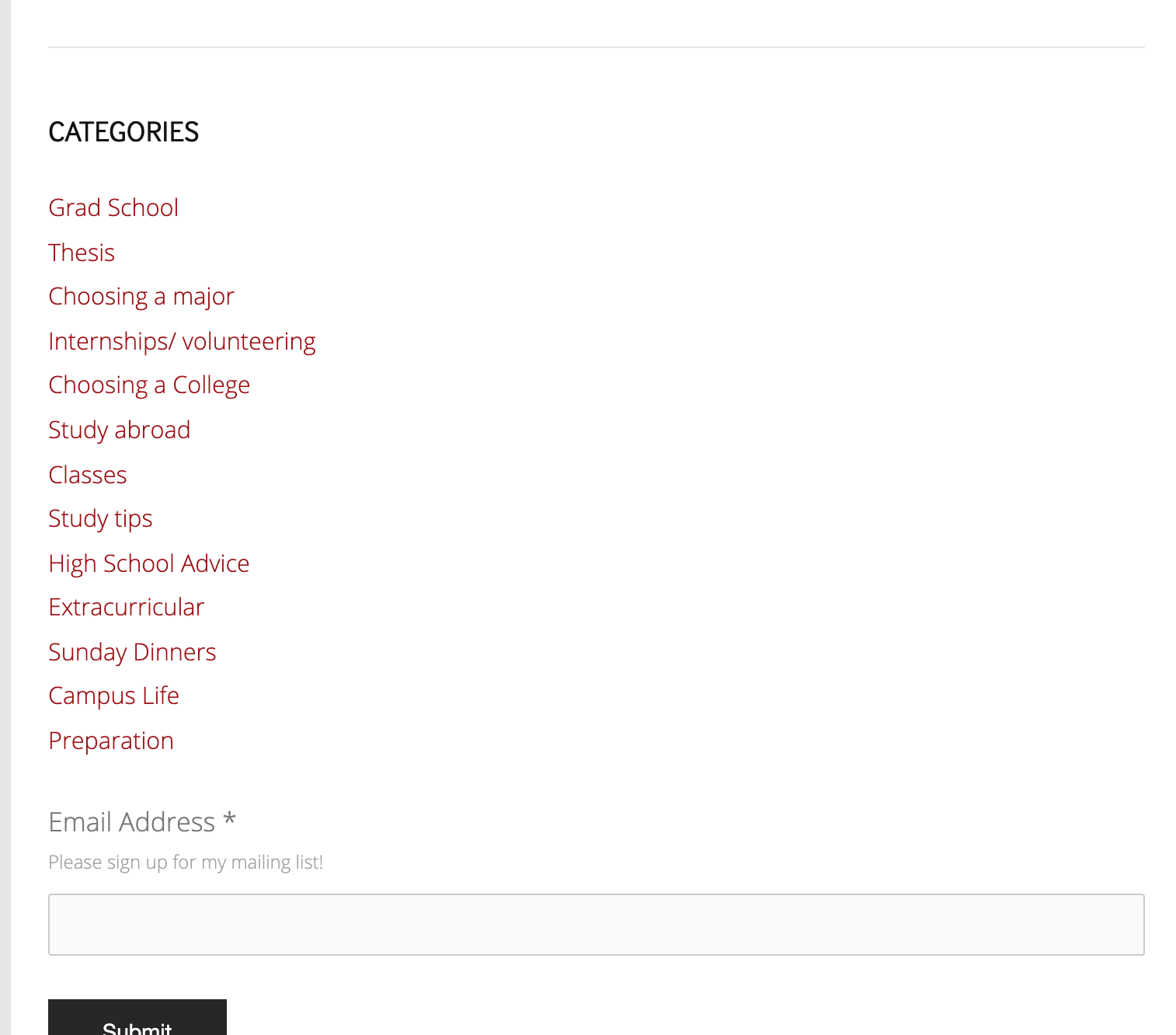Reading through “My College Advice” not only inspired future blog posts, but also inspired to me to take Dwyer’s advice directly. While the blog centers around college, Dwyer places small bits of encouragement throughout her posts that have more to do with self identity rather than campus life. I think that these tidbits personalize her blog and help her connect to her audience in a more intimate way. Each post is derived from the same basic layout, but her inclusion of different style fonts and pictures give each post their own identity and does not bore the viewer into clicking off her blog. Additionally, Dwyer features guest speakers onto her blog to cover more broad issues like sexual assault on campus or clubs in specific universities. This allows her blog to reach a more expansive audience, all while still connecting to the overall topic of college.