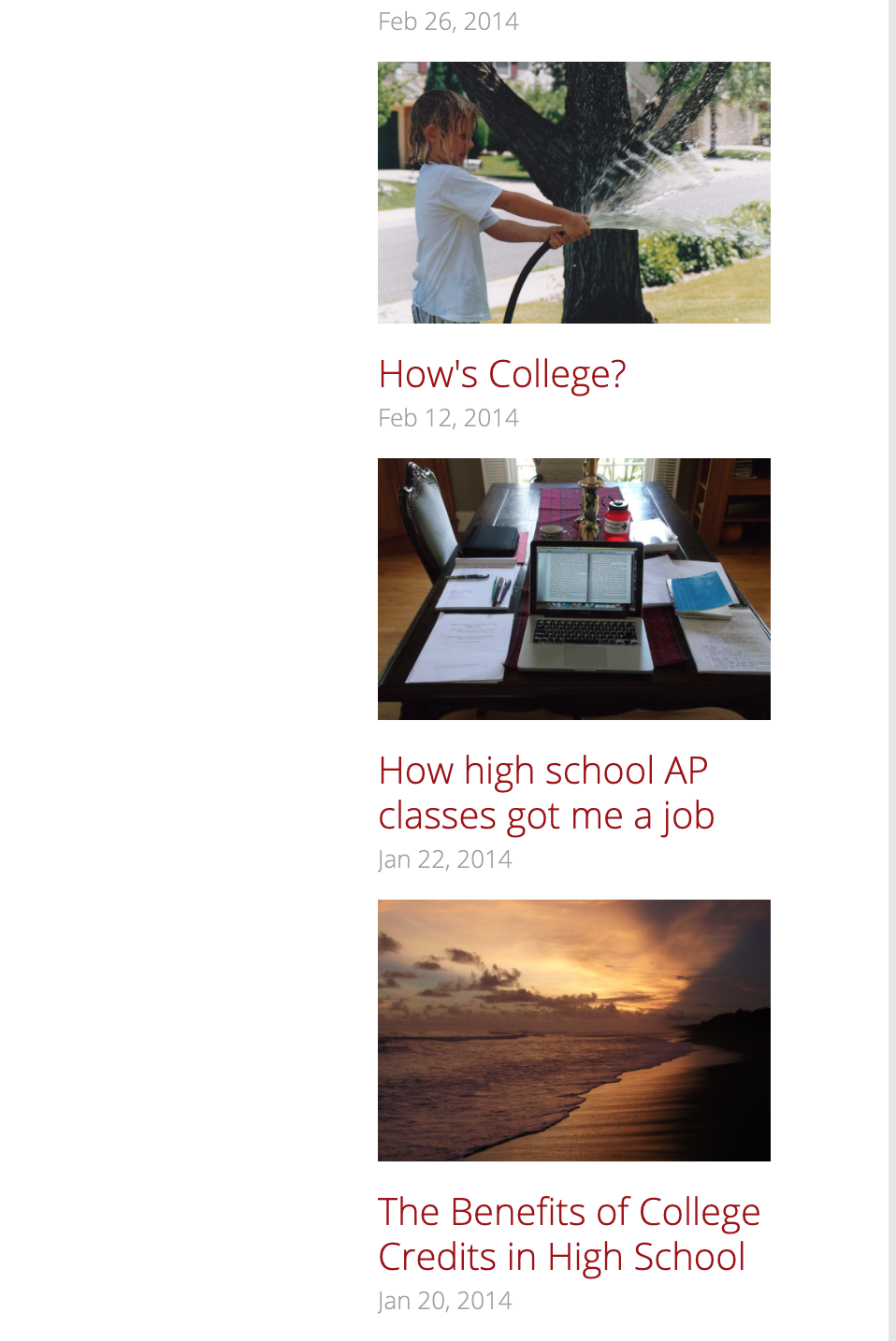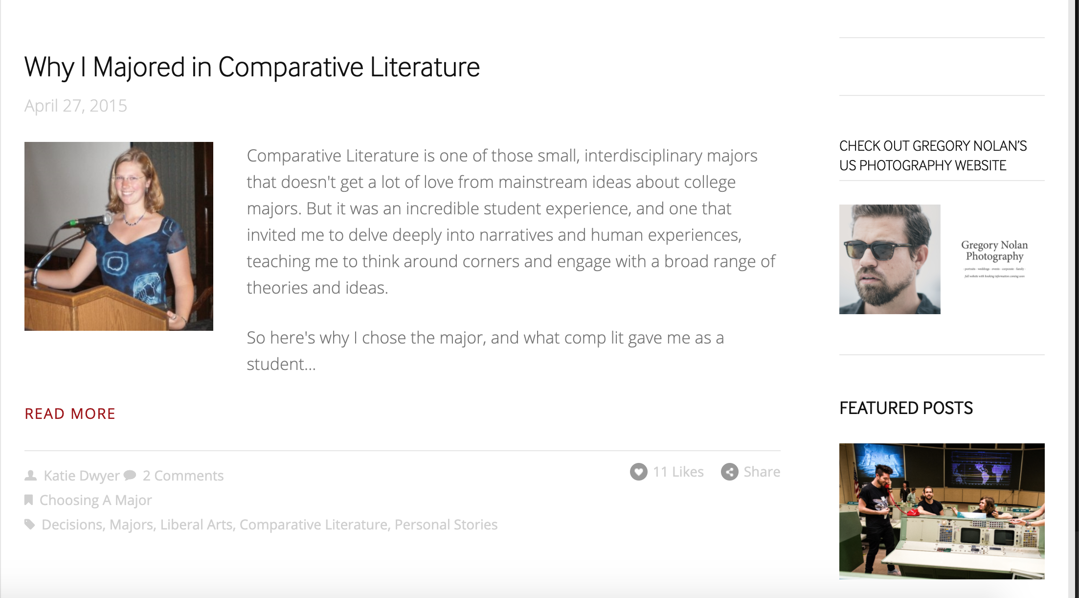 Right from the start, “My College Advice” is very visually appealing. The website’s layout is similar to my own WordPress site, but definitely more advanced and intricate. The main page features Dwyer’s most popular articles; the bottom of the main page breaks off into different categories like “Study tips”, “Choosing a major” and “Grad School”. Each post on display includes a title, a summary of the article, and a picture. The combination of these three elements entice viewers and compels them to read the full posts.